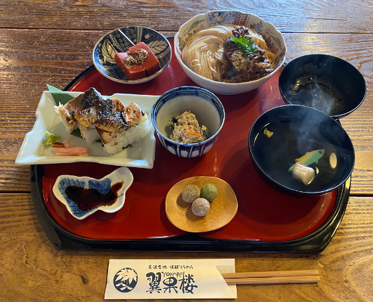 「鯖そうめん」は、田植えなどで忙しくなる5月の農繁期に、農家へ嫁いだ娘を持つ親が気遣い、嫁ぎ先へ焼き鯖を届ける「五月見舞い」というならわしがあり、田植えの時期には米を切らしている農家が多く、保存食として置いてあったそうめんを使って、その焼き鯖とあわせて食べたのが由来ともいわれています。