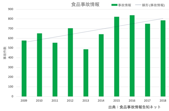 一般財団法人食品産業センターの食品事故情報告知ネットによると2018年の事故情報の状況は、年間総件数786件で、2017年の750件よりも36件増(前年比104.8%)であり、総件数の年毎の推移は、増加傾向になっています。なお、1年間の中では後半に若干の増加傾向が見られたことは昨年・一昨年と同様となっています。
