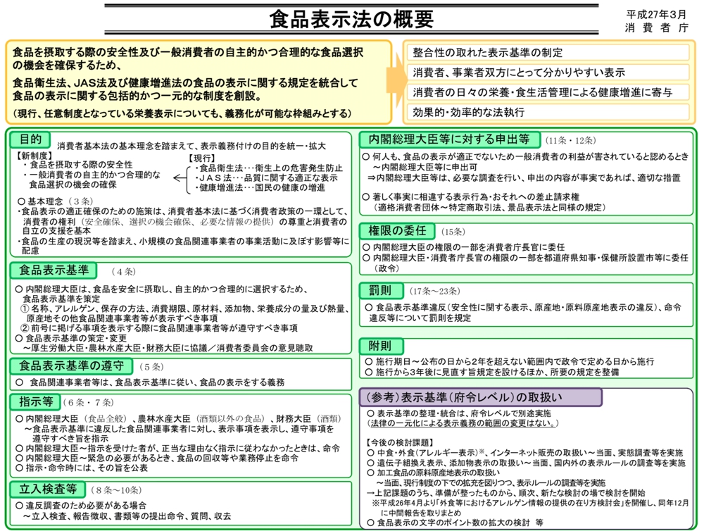 なお、食品の表示は、これまで食品衛生法、JAS法及び健康増進法の法律に定めがあり、非常に複雑なものになっていました。しかし、これらの3つの法律の食品の表示に係る規定を一元化した「食品表示法」が平成25年6月28日に公布されました。そして、「食品表示基準」が策定され、「食品表示法」が平成27年4月1日に施行されました。食品表示法の経過措置期間は、加工食品及び添加物が平成32年3月31日まで、生鮮食品は経過期間が既に終了しています。