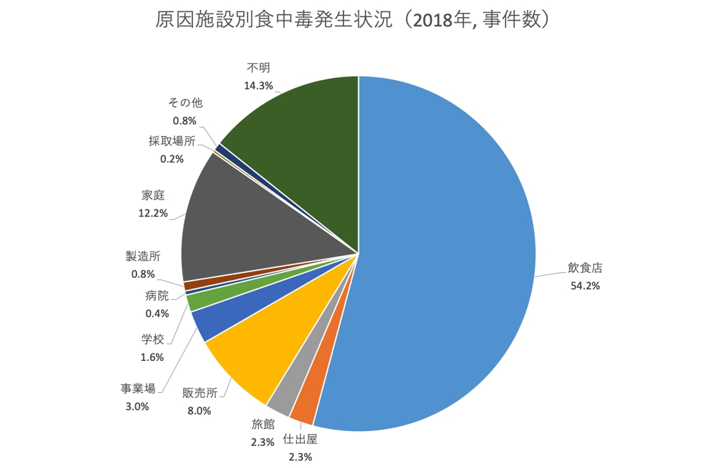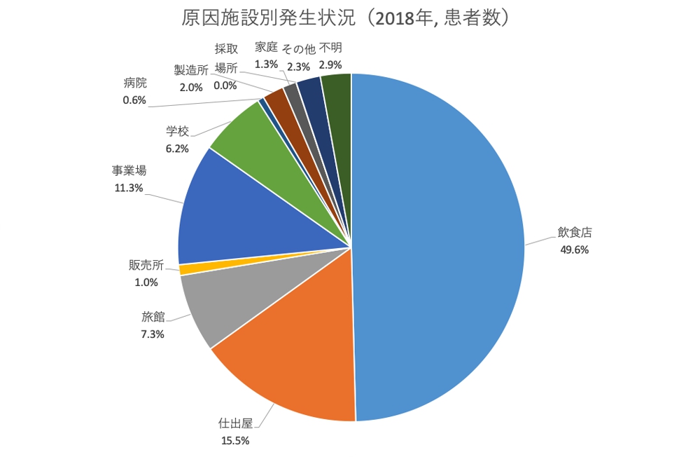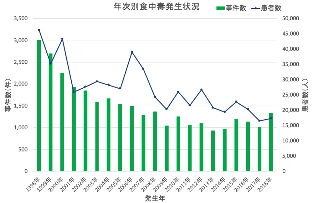 2018年の食中毒事件数は1,330件(前年比316件増加)、患者数は17,282人(818人増)と前年を上回る結果になっています。