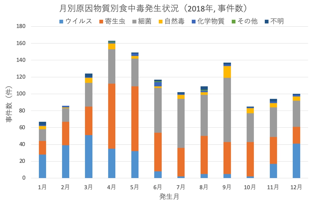 月別の事件数は、4月〜5月が多く、患者数は12月, 3月が多くなっていた。2018年は、4-5月に寄生虫(主としてアニサキス)、これは、6-9月は細菌(カンピロバクター、ウエルシュ菌など)、12-4月はウイルス(ノロウイルス)が主に原因物質となっています。