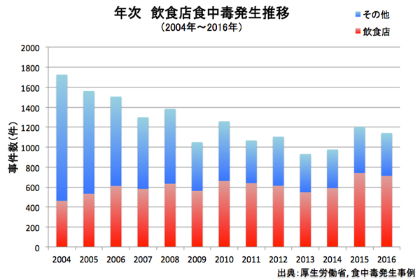 しかし、飲食店の食中毒事件数は、2004年以降横ばい若しくは若干の増加傾向が見られます。