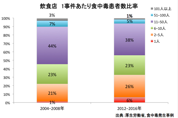1事件あたりの食中毒患者数は、2004〜2008年と2012〜2016年を比べれば、5人以下(特に1人)の発症における報告例が増えています。食中毒に関しては、連日何らかの報道があり、お客様に食中毒に対する意識が高まっています。これにより、昔は一緒に飲食した複数仲間が体調を悪くしたら食中毒を疑って、保健所に報告されていましたが、最近は1人でも体調を悪くすれば保健所に報告しているものと考えられます。