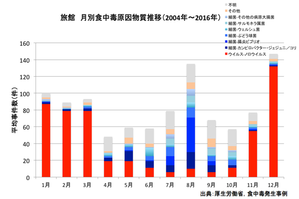 月別の食中毒の原因物質は、冬にノロウイルスが、夏にカンピロバクターや腸炎ビブリオなどの細菌の食中毒の発生が増えています。特に、旅館・ホテルでは、海の幸としての新鮮な魚介類のお刺身が提供されることが多いので、腸炎ビブリオなどへの留意が必要です。