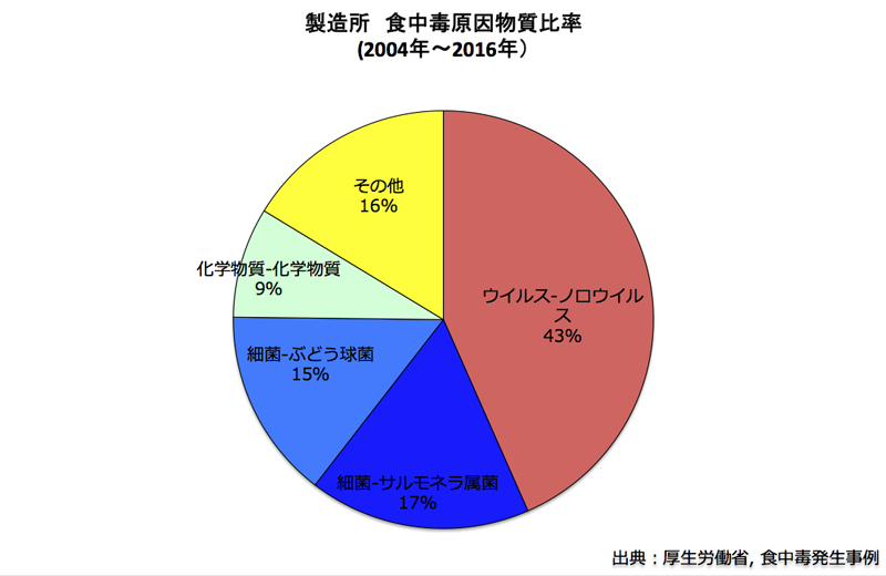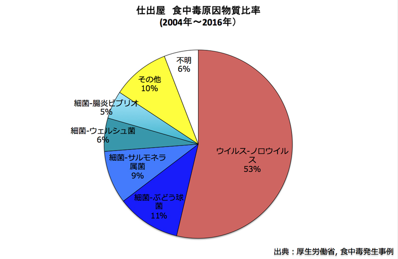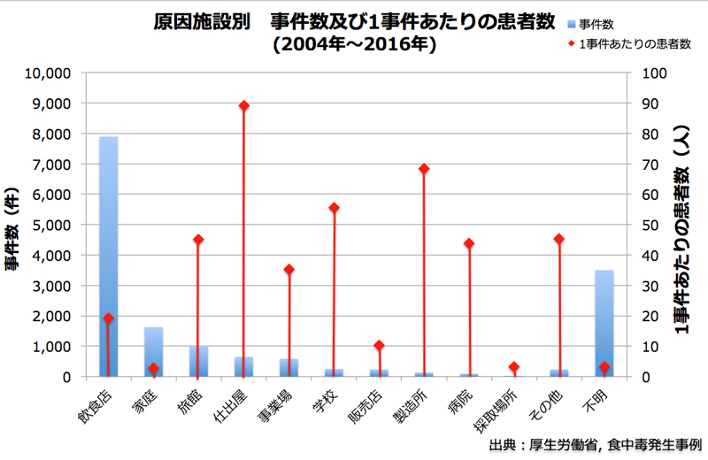 2004-2016年の事件数は、飲食店が7897件と圧倒的に多く、仕出屋(648件)、製造所(129件)は非常に少なく、仕出屋等は衛生管理の意識が高いことが伺われます。しかし、1事件あたりの患者数は、仕出屋(89人)、製造所(69人)と食中毒事件の影響が大きいのもです。例えば、2017年にノリの製造業者による食中毒事件では、和歌山の小中学校と幼稚園で719人、東京の小学校で835人の食中毒患者が出ています。
