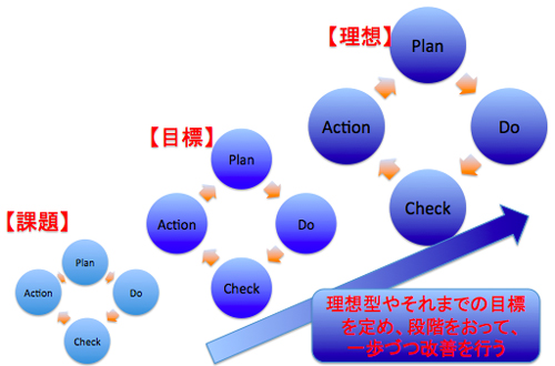 なお、PDCAサイクルを継続的に回すということは、単に過去を継承しながら回すのではなく、目標や理想に向かって、回すことが大切です。