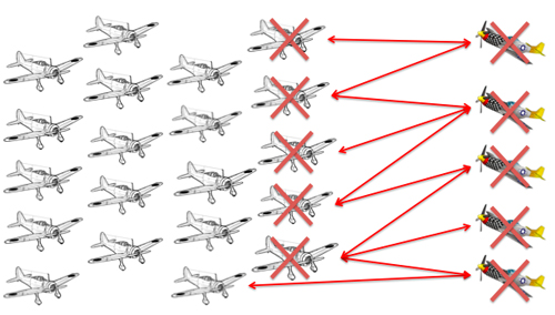 飛び道具などを用いて、多対多の戦いをする場合の法則です。