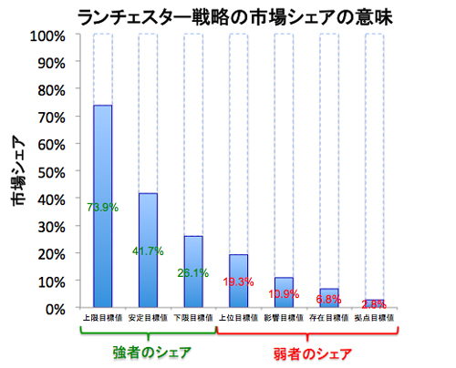 市場におけるポジショニングは、市場シェアで評価されます。故田岡信夫氏及び斧田太公望氏により、強者及び弱者が目標とする市場シェアが設定されています。
