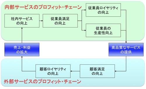 企業が「社内サービスの質」を充実させることで、「従業員満足(ES)」を向上させ、それが「従業員ロイヤリティ」並びに「生産性」を向上させ、提供する「サービス水準」が向上するものです。