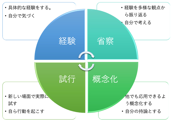 この理論では、「経験からの学び」を体系化された知識を受動的に習い覚える知識付与型の学習やトレーニングと期別し、経験からより良くより深く学ぶには、「具体的な経験」をじっくり振り返るプロセスが大切で、振り返ったら、それを次の経験に活かせるように「抽象的概念化」することが重要だと言っています。そしてそこで得た新しい考えや方法に基づいて行動を起こせば、今までとは異なる具体的な経験を積むことになり、経験学習はより良い形でまわっていくとしています。