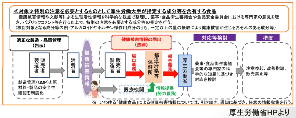 ・薬事食品衛生審議会や食品安全委員会などで成分の指定が行なわれていく予定で、これらの製造にはGMPも義務付けられます。