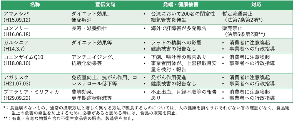 ※:ホルモン様作用をもつ成分等が含まれている食品について、製造管理が適切でなく含有量が均一でないこと、科 学的根拠に基づかない摂取目安量が設定されていること等により健康影響が生じたケースがある。(プエラリア・ミリ フィカを含む食品により、平成29年7月までの過去5年間で、223事例の健康被害が報告。)