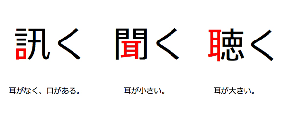 ところで、「きく」には、「訊く」「聞く」「聴く」の3つの字があります。「訊く」は尋ねて聴く、「聞く」は聞こえる、「聴く」は注意して聴くとの意味があります。普段から「聴く」に心掛けたいものです。