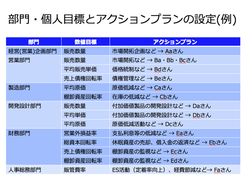 ROA及び分解項目の数値目標の達成のため、それに関連する部門に目標を展開します。各部門は、この数値目標を達成するためのアクションプランを立案し、実行します。さらに、このアクションプランは個人目標として割当て、成果を人事考課で評価することが大切です。これにより、「個人目標の達成」→「部門目標の達成」→「経営目標の達成」→「新たな経営目標の設定」と、会社が成長する仕組みが築かれます。
